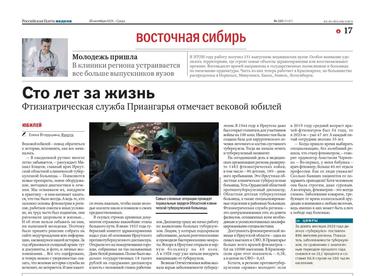 В "Российская газета - Неделя" на региональной вкладке Восточная Сибирь опубликован материал, посвященный юбилею фтизиатрической службы Иркутской области.